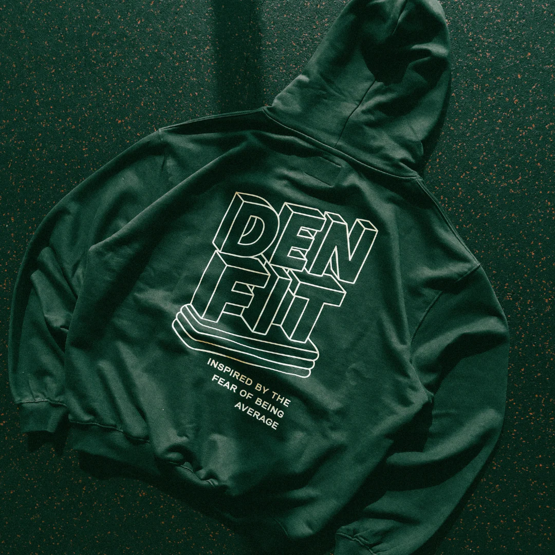 A heavyweight organic terry hoodie in deep Pine Grove green, finished with a bold DENFIT puff print and an oversized premium fit.