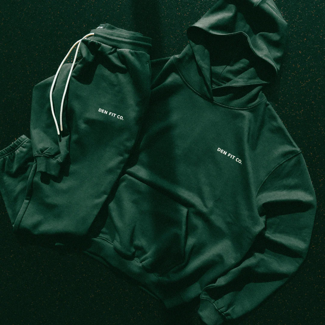 Heavyweight organic terry sweatpants in a deep Pine Grove green. Clean taper, premium feel, and subtle DEN FIT CO. detailing.